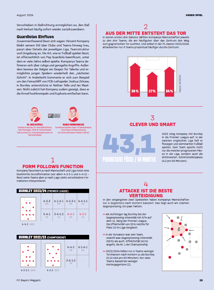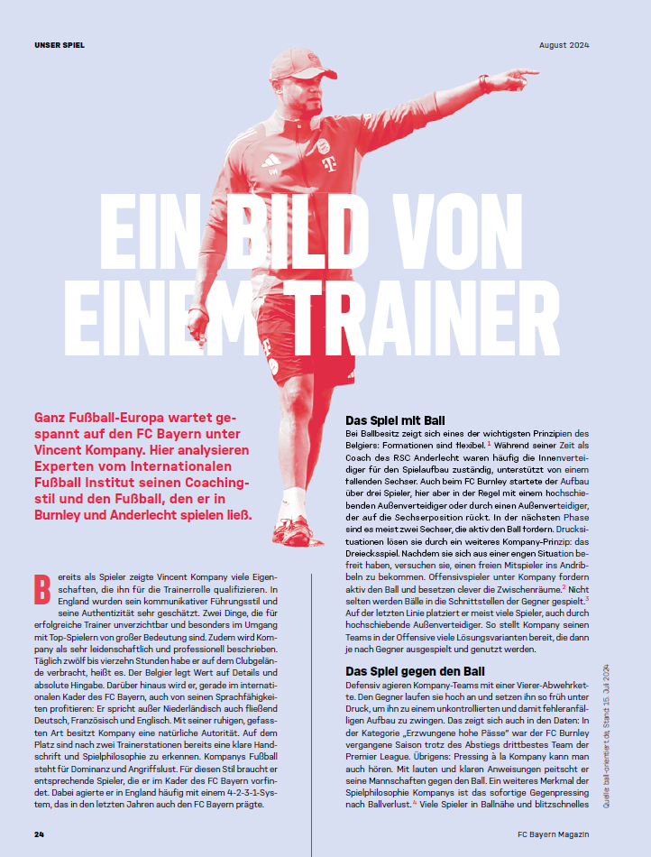 Wer war nicht überrascht, als feststand: Neuer Tainer des FC Bayern München ab der Saison 2024/25 wird Vincent Kompany. Für fast alle Fachleute hierzulande war und ist der Belgier, den die Bayern am 30. Mai offiziell vorstellten, als Coach ein unbeschriebenes Blatt. Nicht jedoch für die Experten des IFI, die vom FC Bayern Clubmagazin „51“ den Auftrag erhielten, den 38-jährigen Ex-Spieler u.a. des HSV und von Pep Guardiolas Manchester City für die August-Ausgabe zu porträtieren. Markus Brunnschneider, Fachbereichsleiter Spiel- & Taktikanalyse, Scouting und Kaderplanung am IFI, und Dr. Anselm Küchle – der stellvertretende Geschäftsführer am Internationalen Fußball Institut schrieb seine Doktorarbeit zum Thema Trainerkompetenzen im Spitzenfußball – sahen sich das Wirken Kompanys als Trainer des FC Burnley und des RSC Anderlecht genauer an. Hier ist das Ergebnis aus der aktuellen „51“ – so lässt Vincent Kompany spielen, so tickt der neue Bayern-Trainer: