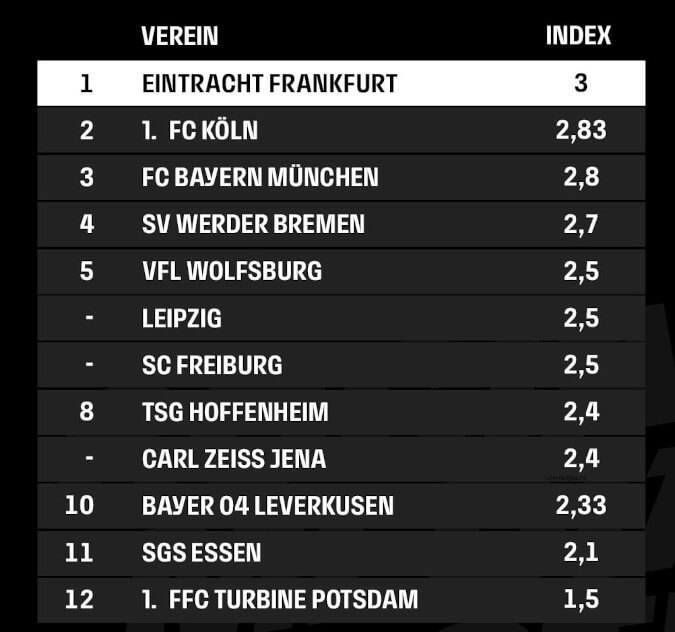 Untersucht wurden die Facebook- und Instagramkanäle der zwölf Frauen-Bundesligisten anhand verschiedener Kriterien, darunter Wachstum, Interaktionsraten, Anzahl der Posts und Reichweiten. Für alle Kriterien wurden jeweils 1 bis 4 Punkte vergeben, aus denen sich eine Gesamtpunktzahl und mithilfe einer Formel der Social-Media-Index ergibt.
