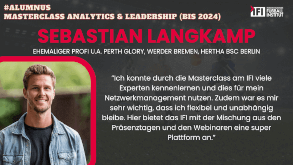 Das Spielanalye-Zertifikat des IFI ist eine unglaublich wertvolle Erfahrung. Besonders beeindruckend war die Möglichkeit von Experten zu lernen und Einblicke in die Welt des professionellen Fußballs zu bekommen. Auch der Austausch mit den anderen, teils hochkarätigen Teilnehmern aus dem professionellen Fußball hat mir wertvolle Erfahrungen aus der Praxis vermittelt und aufgezeigt, welche Möglichkeiten es im Analyse-Bereich gibt und wie dort gearbeitet wird.”